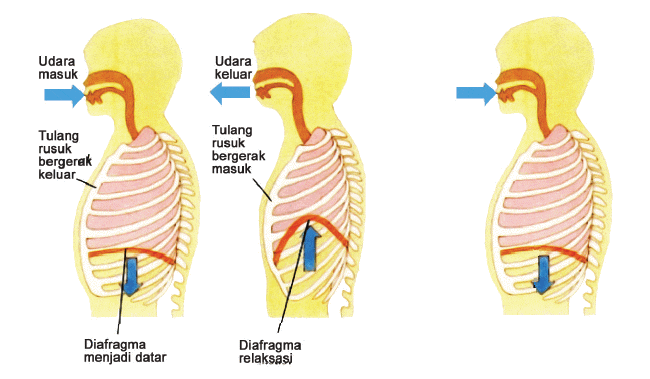 Saat kita menghirup udara, diafragma akan berkontraksi menjadi lebih datar. Saat itu paru-paru membesar untuk mampu menampung udara yang kita hirup. Saat kita menghirup udara, otot-otot tulang rusuk mengangkat tulang rusuk kita sehingga paru-paru membesar.